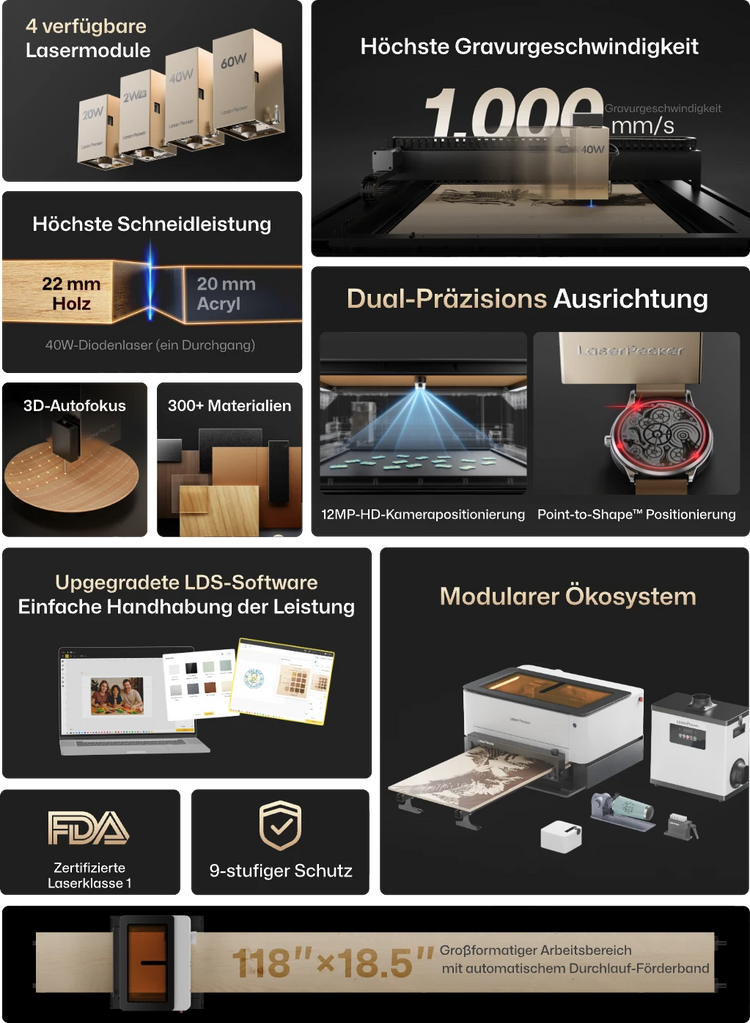 | Lasertyp | 20W, 40W, 60W (coming soon) Blue Diode Laser