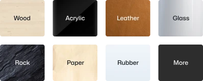 wood, acrylic, leather, glass, rock, paper, rubber