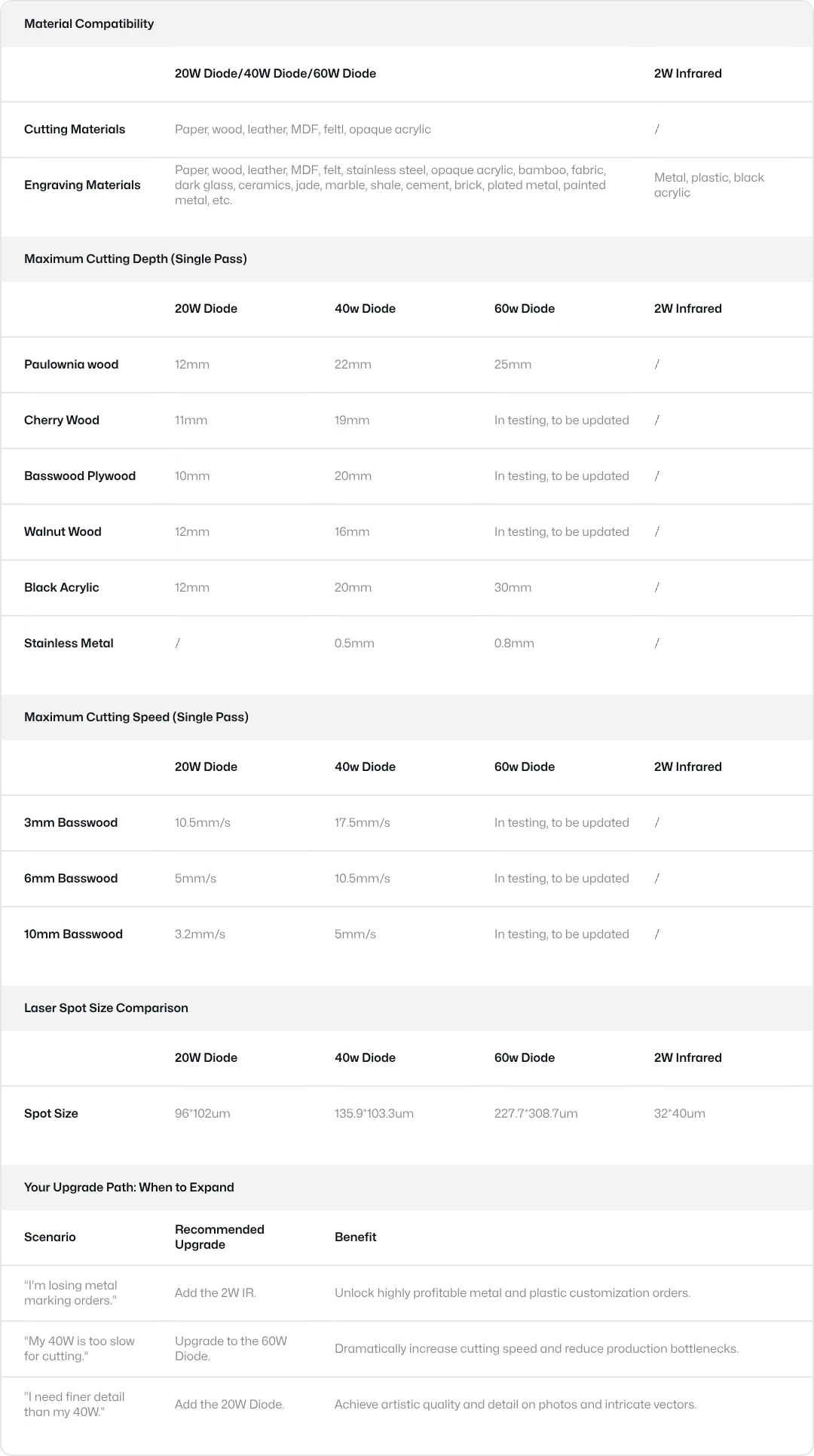 · 20W Diode Laser: 114 mm × 77.4 mm × 72 mm | 4.49″ × 3.05″ × 2.83″